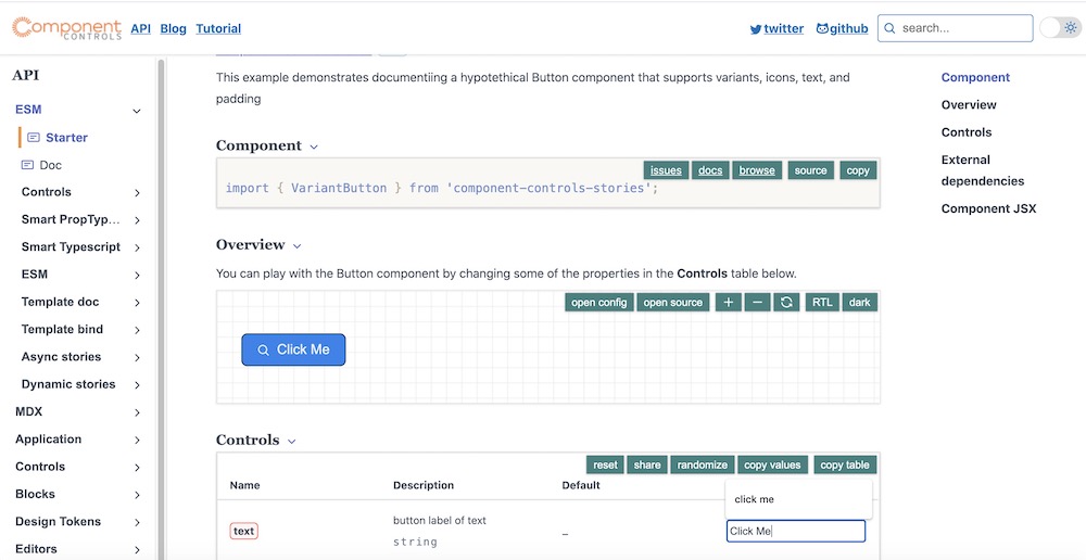 This example demonstrates documenting a hypothetical Button component that supports variants, icons, text, and padding